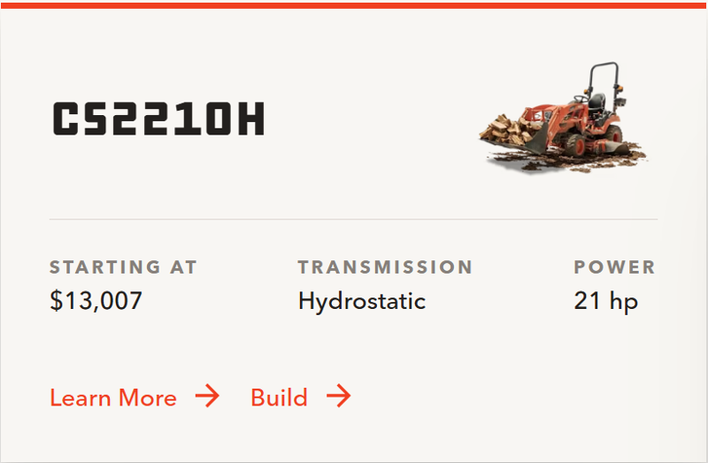 The KIOTI CS2210 is a 21 horsepower sub-compact tractor perfect for properties up to 5 acres, featuring a hydrostatic transmission for easy operation and a three-point hitch for versatility with various attachments.